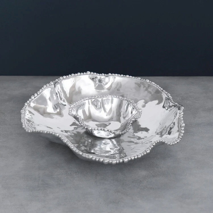 A fabulous new addition to our bestselling ORGANIC PEARL Collection, the onyx dip bowl is a practical piece with style to spare. The two-parter is the essence of versatility, and can be used for serving not only chips and dip, but a variety of your favorite foods. Its dramatic contours and sparkling beaded rim make for an eye-catching serving piece and a sensational gift item. Beatriz Ball’s intensely handmade products use eco-friendly and sustainable materials and are crafted by artisans who trace a heritage of metalworking for generations. Made of a top quality, FDA safe, easy-care, oven and freezer friendly aluminum alloy.