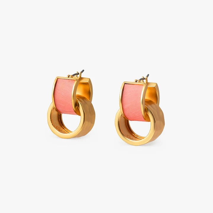 Add a touch of playful elegance to your look with the Rum Cay Huggie Hoop Earrings, featuring soft shrimp pink turkey feathers that bring a warm, delicate pop of color. These versatile earrings can be styled multiple ways – wear them as simple huggies, or enhance the design by layering with the removable hammered brass accents for a bold, statement-making effect.
